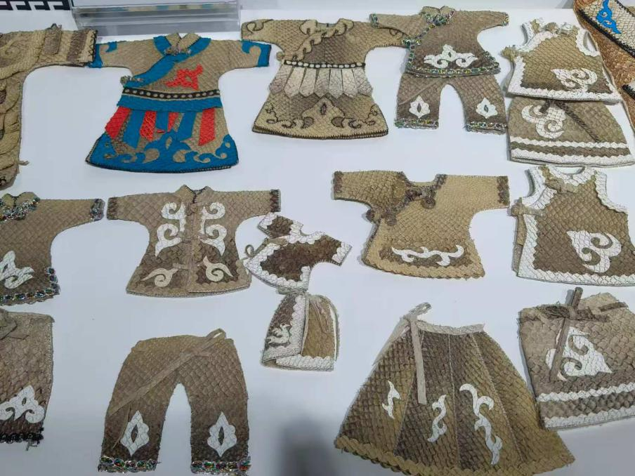 由赫哲族鱼皮非遗工艺制作的赫哲族传统服饰工艺品与精美挂件。