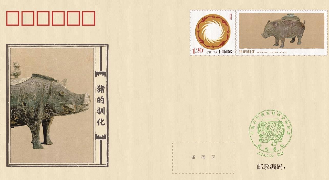 图①②: “猪的驯化”纪念封及内插页。(中国集邮有限公司供图)