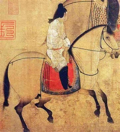 唐代画家张萱的《虢国夫人游春图》局部。从图中可以看到唐代马靴的式样。(图片由作者提供)