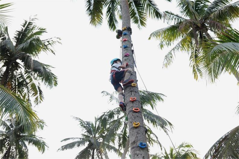 通过模拟航天员野外生存挑战训练科目,在茂密的椰林攀椰竞速中,同学们整装待发,奋力向上。航天精神激发了他们的勇气,让他们敢于面对挑战和困难,勇往直前。