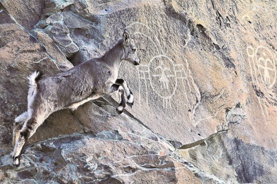 阳光照进寒风凛冽的贺兰山谷,增添了几分暖意。矫健的岩羊在陡峭崖壁上跳跃,偶尔跨过岩石上深凿浅刻的岩画,古老图案仿佛瞬间被唤醒。
